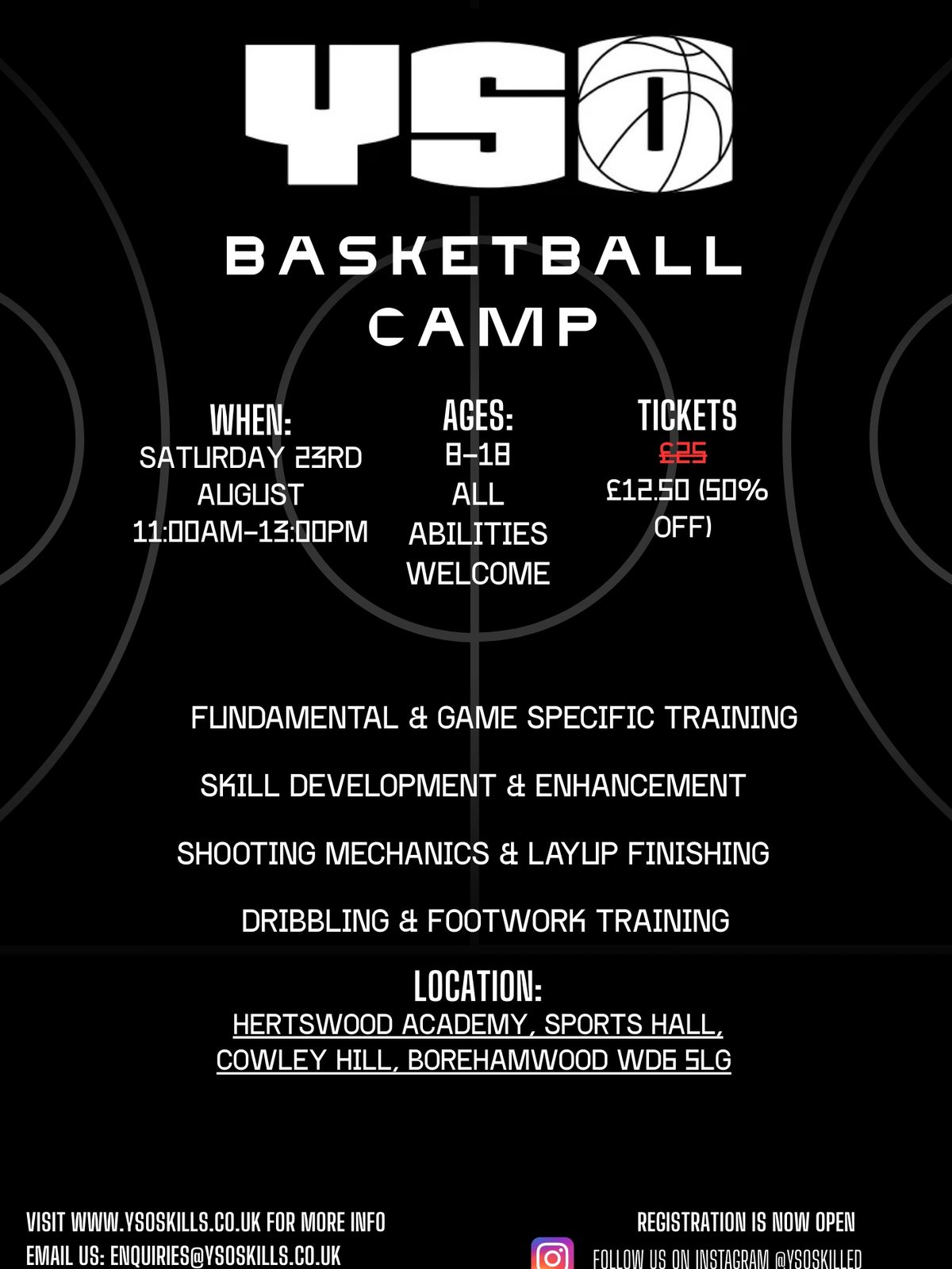 Spaces are limited! Make an enquiry today by emailing Enquiries@ysoskills.co.uk or register at https://www.eventbrite.com/e/yso-skills-basketball-group-session-saturday-9th-august-tickets-1548636345999?aff=oddtdtcreator
